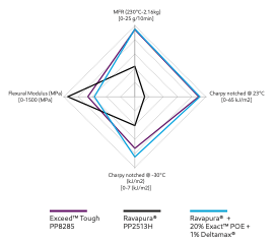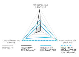 - DeltaMax® performance modifiers can help improve flow rate and help boost impact further over recycled PP with Exact POE through compatibilization of the matrix-rubber interface, thus helping to facilitate particle dispersion and small particle size.