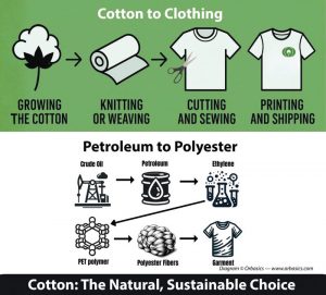Cotton wins when it comes to microplastics. It is that simple. Cotton is a naturally occurring plant that grew on earth’s trees, fell onto its soil, and was disposed of by natural biodegradation long before it clothed its inhabitants. In its natural life cycle, carbon dioxide simply moves back and forth from the atmosphere to the plant and then back into the atmosphere.