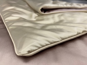The extraordinary blanket is based on a carefully designed warp knitted fabric. The textile for the cover around a filling layer consists of bright polyamide and elastane. It was produced on an HKS 2-SE in gauge E 36 using a suitable lapping and has an extremely dense, smooth surface. The compact structure emphasises the gentle sheen of the polyamide and gives it a cool feel. The elastane material ensures suppleness through stretch.