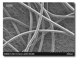 meltblown fibers with an average size of 250 nanometers (nm) and a range between 25 and 400