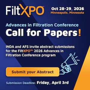 CARY, N.C. — January 7, 2026 — INDA, the Association of the Nonwoven Fabrics Industry, in partnership with AFS, the American Filtration and Separations Society, announces the call for presentations for the Advances in Filtration Conference, to be held October 28–29, 2026, as part of FiltXPO™ 2026 in Minneapolis, Minnesota.