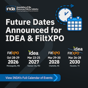 CARY, N.C. — January 13, 2026 — INDA, the Association of the Nonwoven Fabrics Industry, announced the future dates and locations for its FiltXPO™ and IDEA® events, reaffirming its long-term commitment to serving the global filtration, nonwovens, and engineered materials communities.